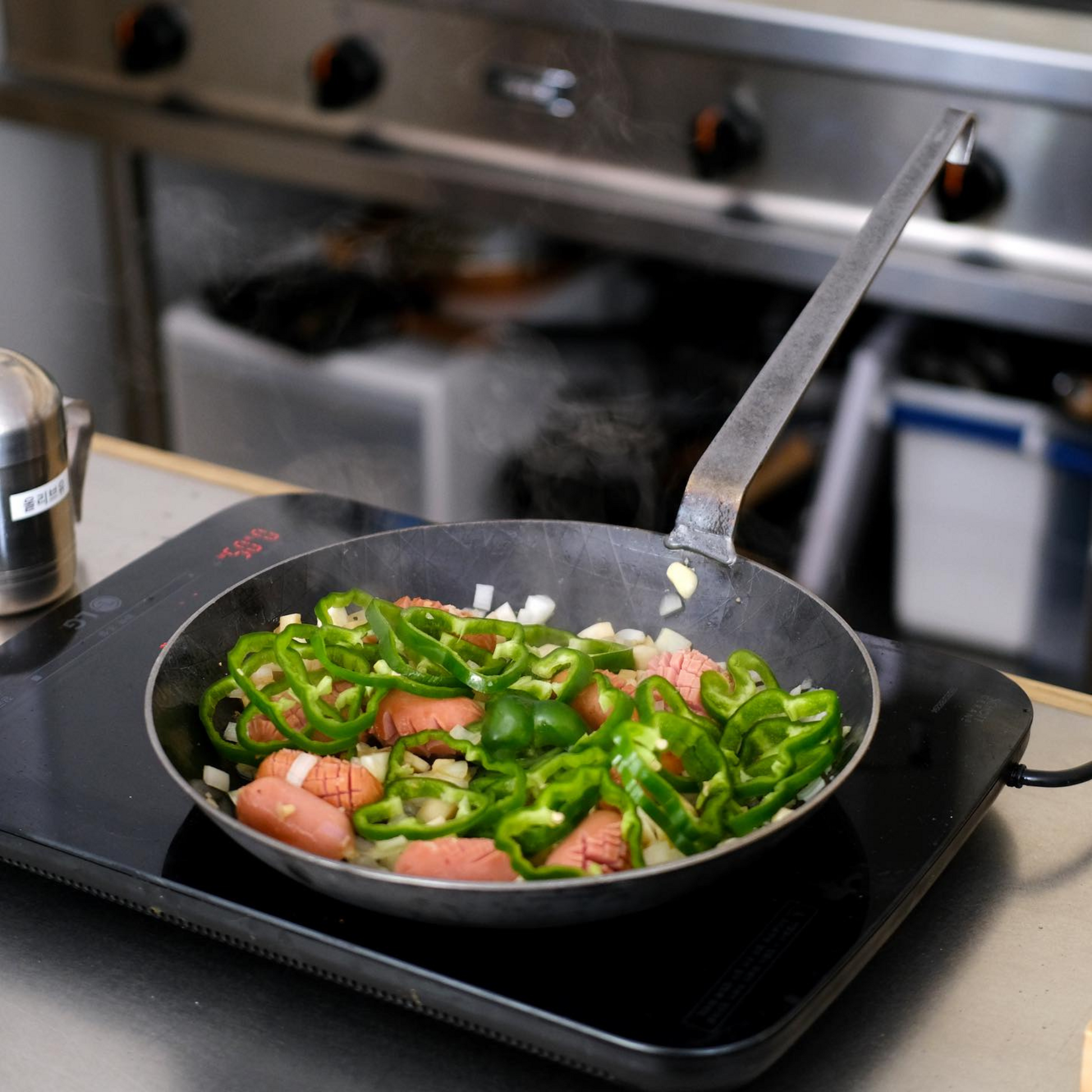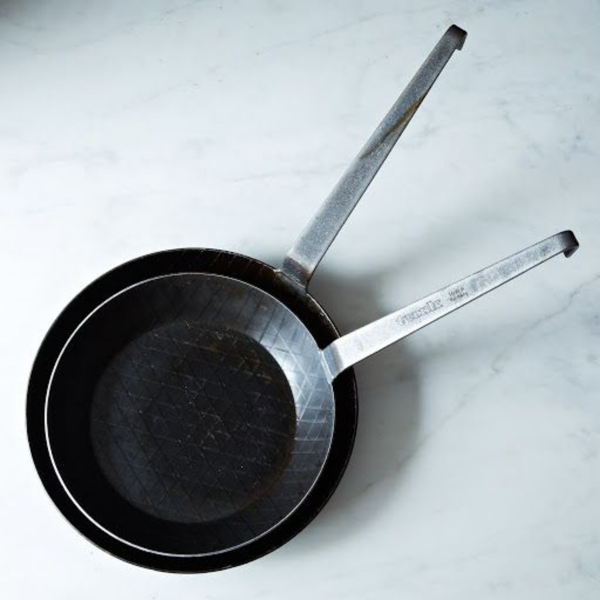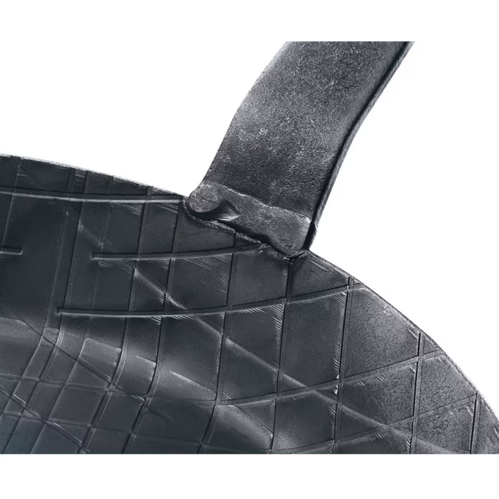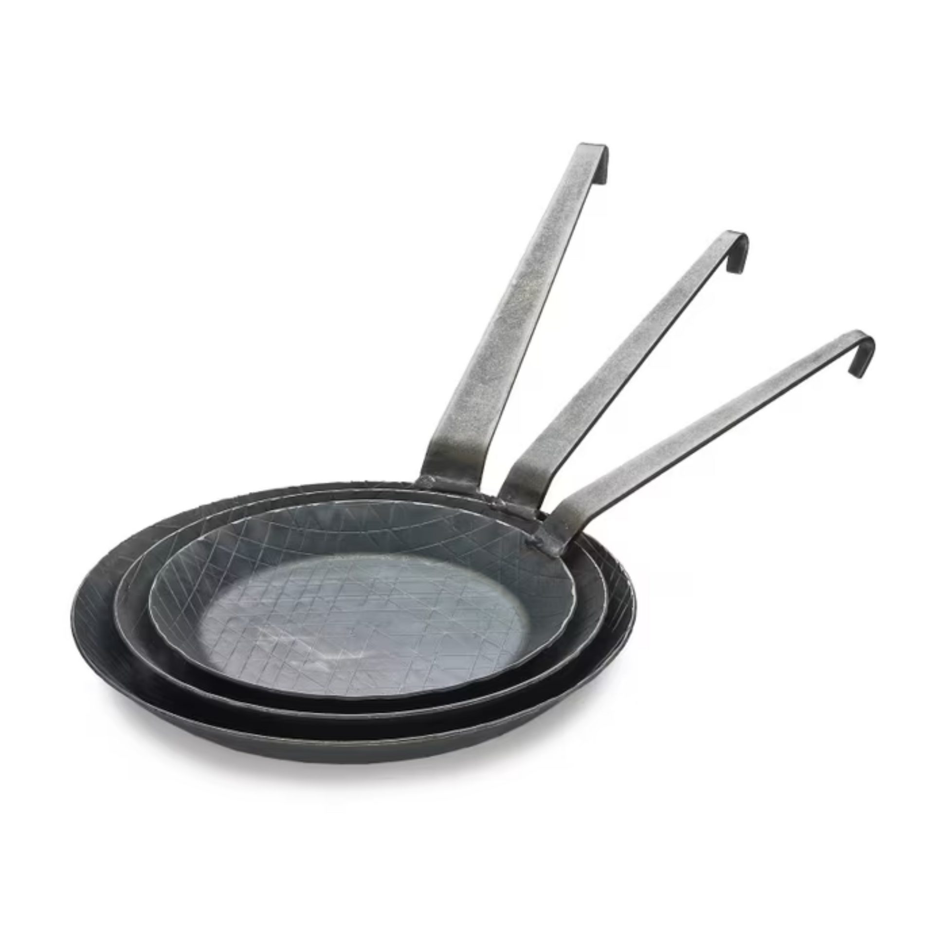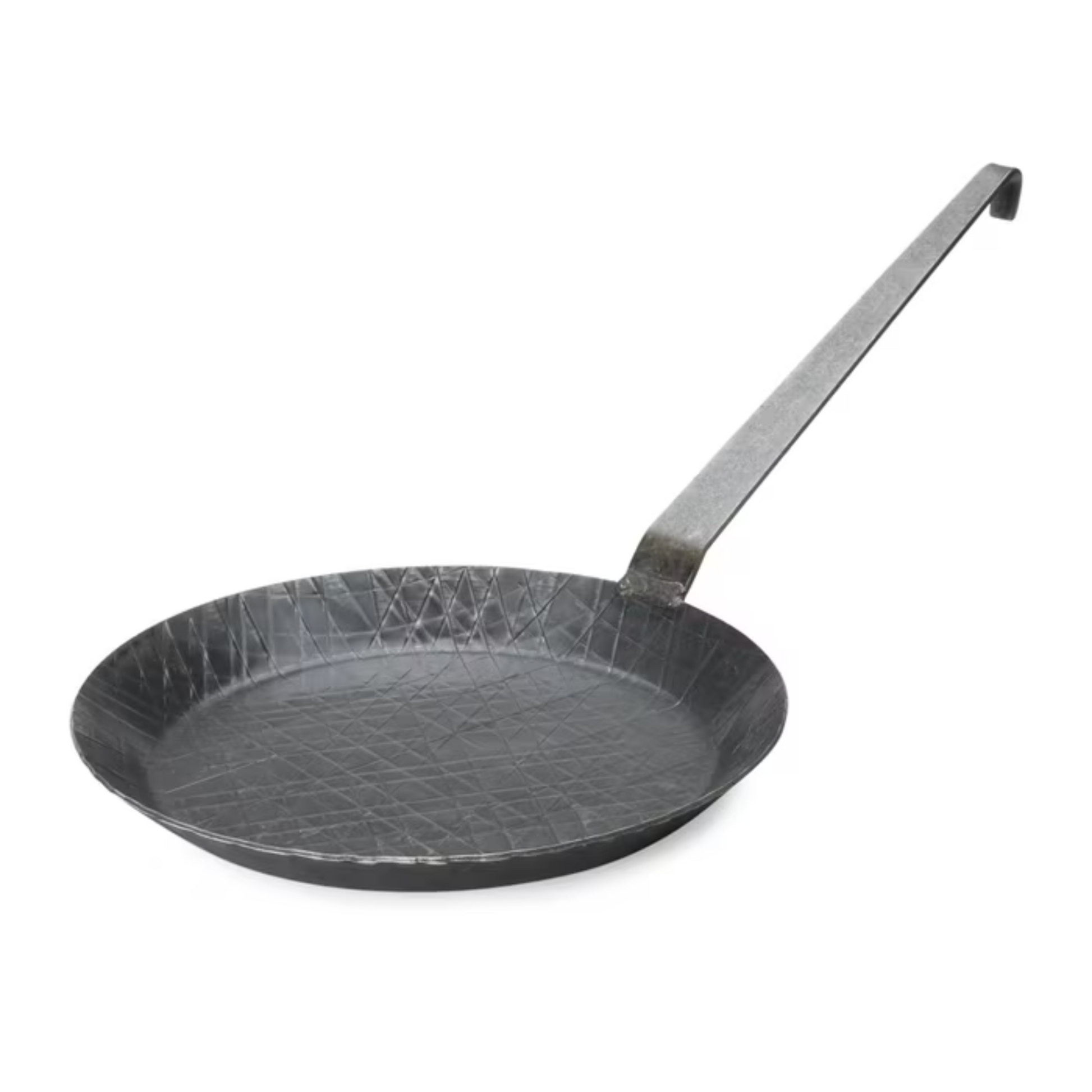 A traditional German frying pan made from wrought iron. The handle is welded instead of riveted for increased durability. This variant features a unique crisscross pattern on its surface.